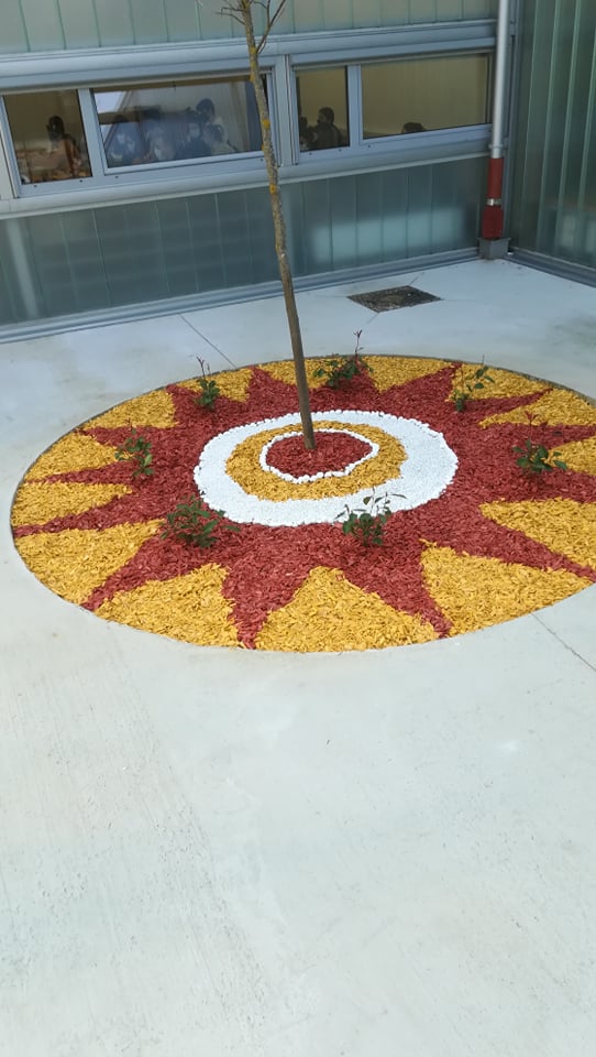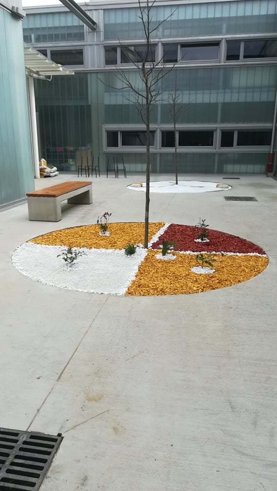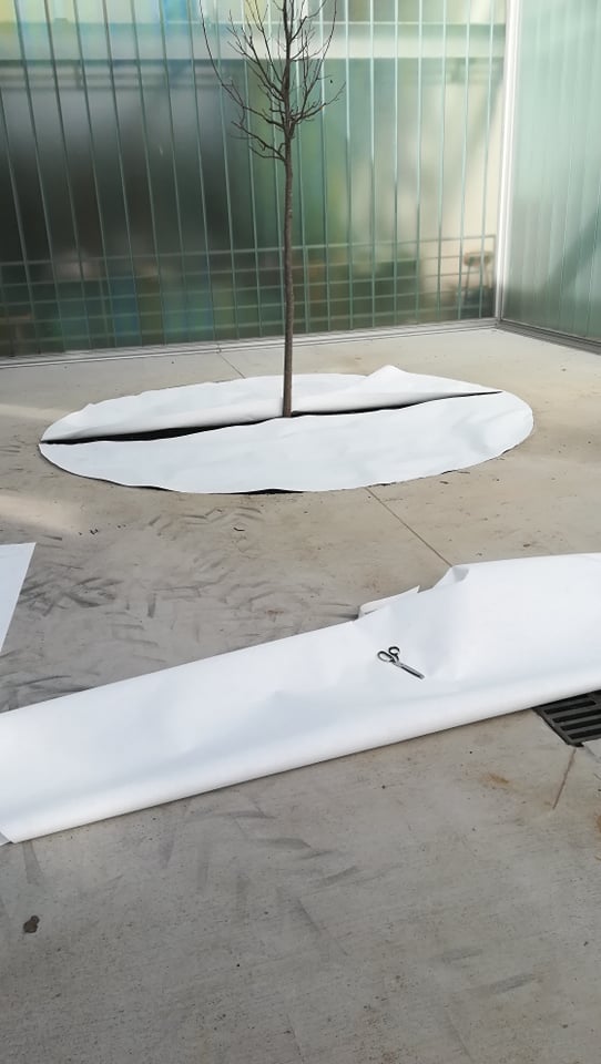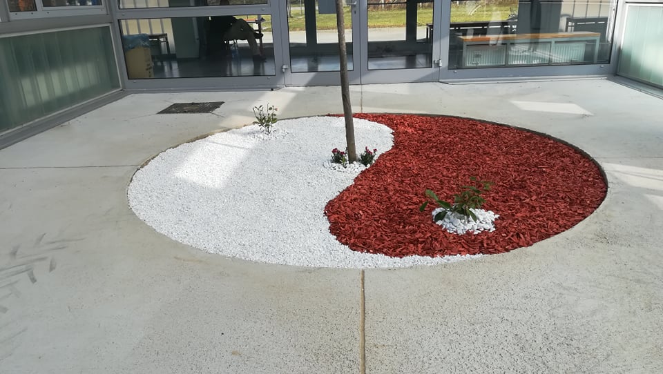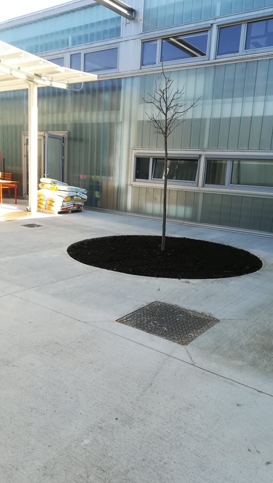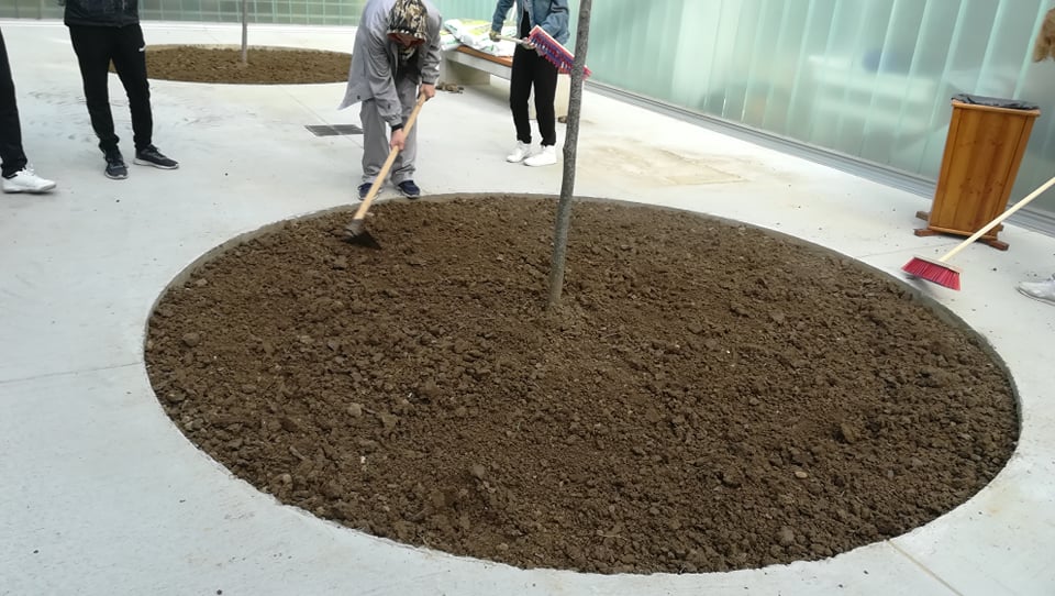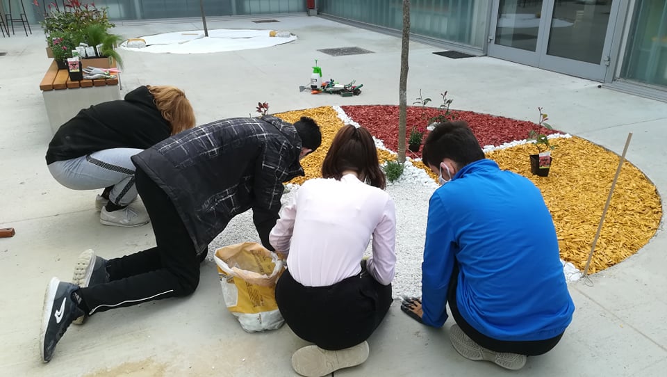 Uslijedilo je usitnjavanje i ravnanje površine koja je postala školski vrt. U vrlo zanimljive okrugle otvore usred atrije koju prekriva beton učenici cvjećari obogaćuju postojeću zemlju plodnim humusom za sadnju cvijeća. Nakon što su humus pomiješali i poravnali slijedilo je prekrivanje tla geotekstilom. Geotekstil je poslužio kao zaštita od korova, ali i pokrov koji će u ljetnim mjesecima zadržavati vlagu.
